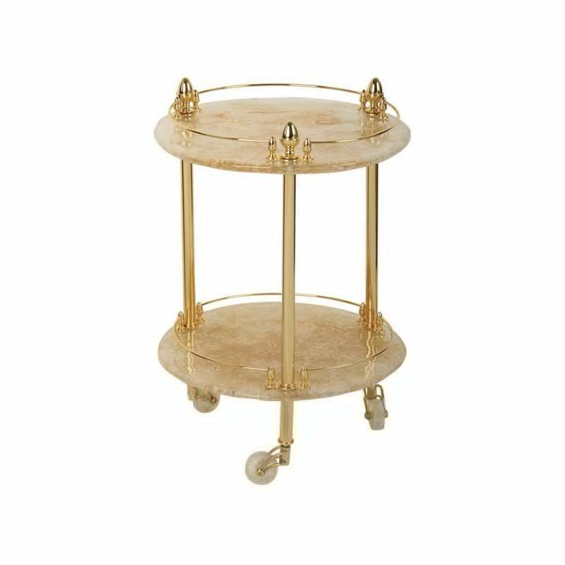 Столик коллекции ELISABETTA бренда MIGLIORE - это красивый и многофункциональный аксессуар, который станет достойным украшением вашего интерьера. У столика имются колеса для удобства его перемещения, две круглых полочки выполнены  из высококачественного декорированного стекла и имеют изящное латунное обрамление по периметру.