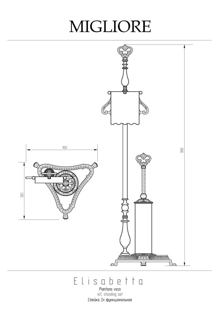 Стойка для унитаза коллекции ELISABETTA бренда MIGLIORE - это многофункциональный и красивый аксессуар для ванной комнаты. На стойке расположены бумагодержатель с крышкой и латунный декорированный ерш, внутри которого вставлена пластиковая колба, которую можно вынуть, чтобы помыть.
