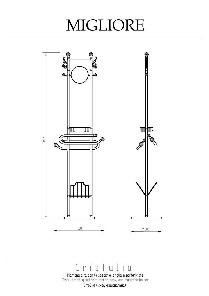 Стойка высокая для халотов и полотенец коллекции CRISTALIA бренда MIGLIORE — это красивый и многофункциональный аксессуар для ванной комнаты. На стойке расположены крючки, оптическое двухсторонее зеркало, решетка-корзинка, полотенцедержатели, и держатель для планшета/журналов. Аксессуар богато украшен кристаллами Сваровски.