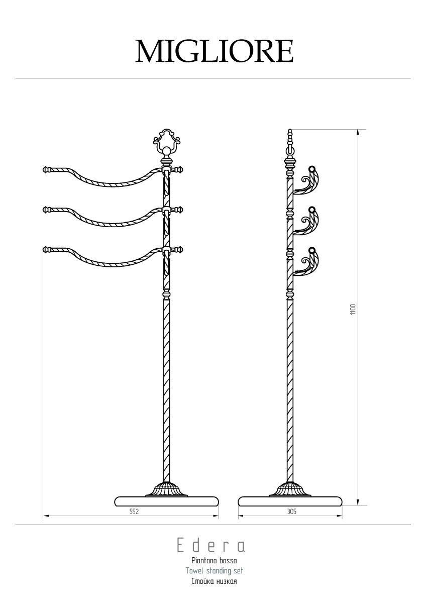 Стойка низкая коллекции EDERA бренда MIGLIORE  - это многофункциональный аксессуар для ванной комнаты с тремя поворотными перекладинами для полотенец. Благодаря витым элементам аксессуары коллекции EDERA будут смотреться элегантно в классическом интерьере ванной комнаты.