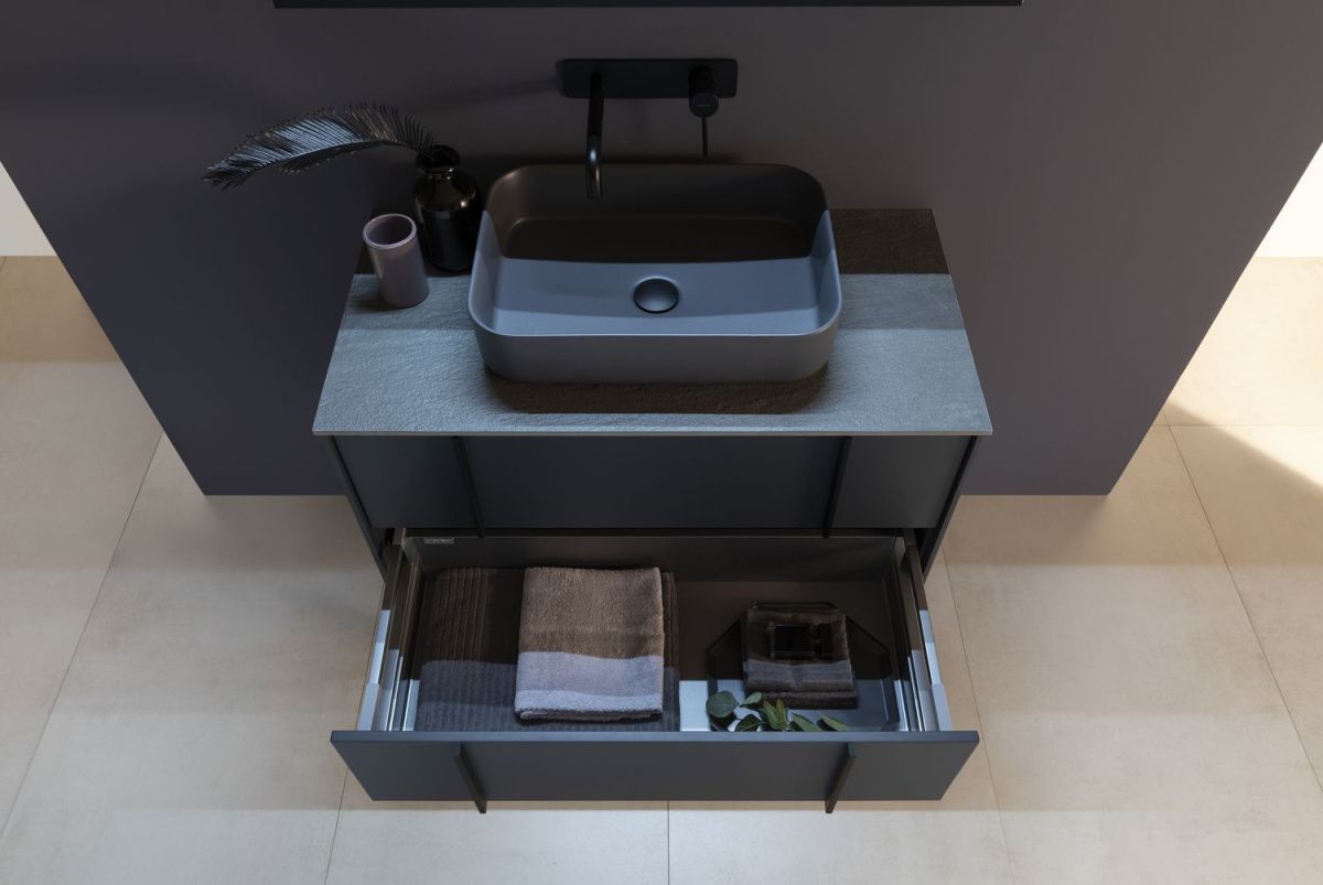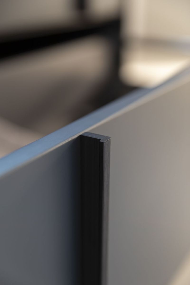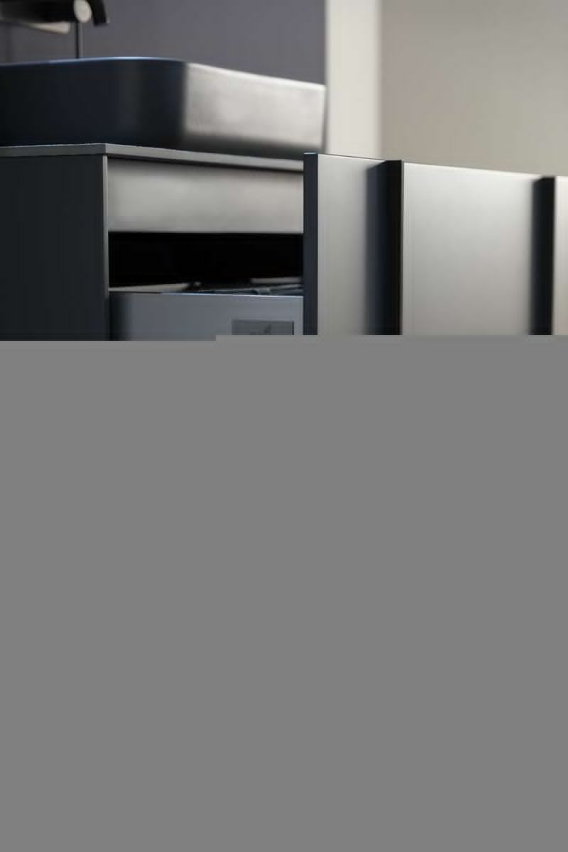 Выдвижные ящики с металлическими боковыми стенками в цвете серый металлик.