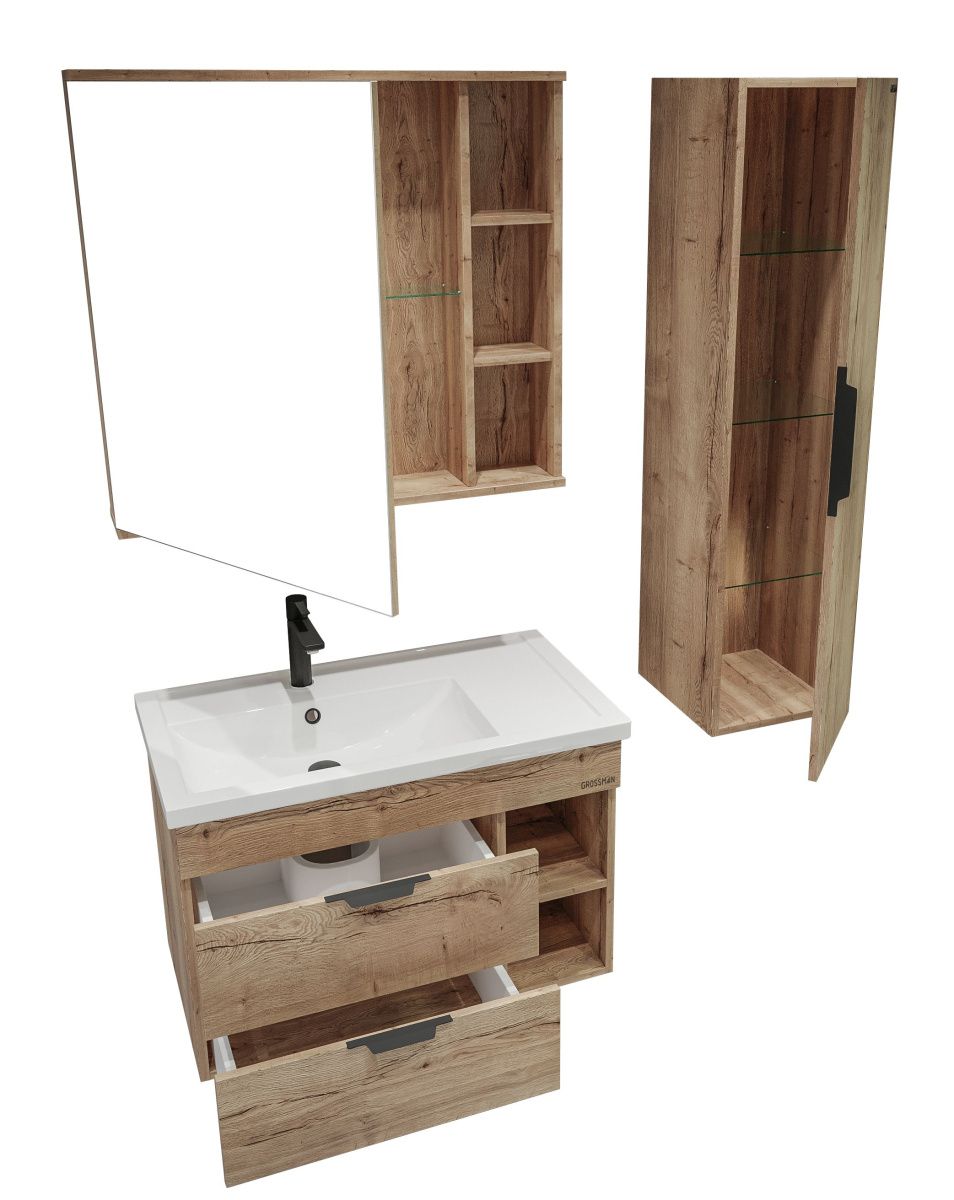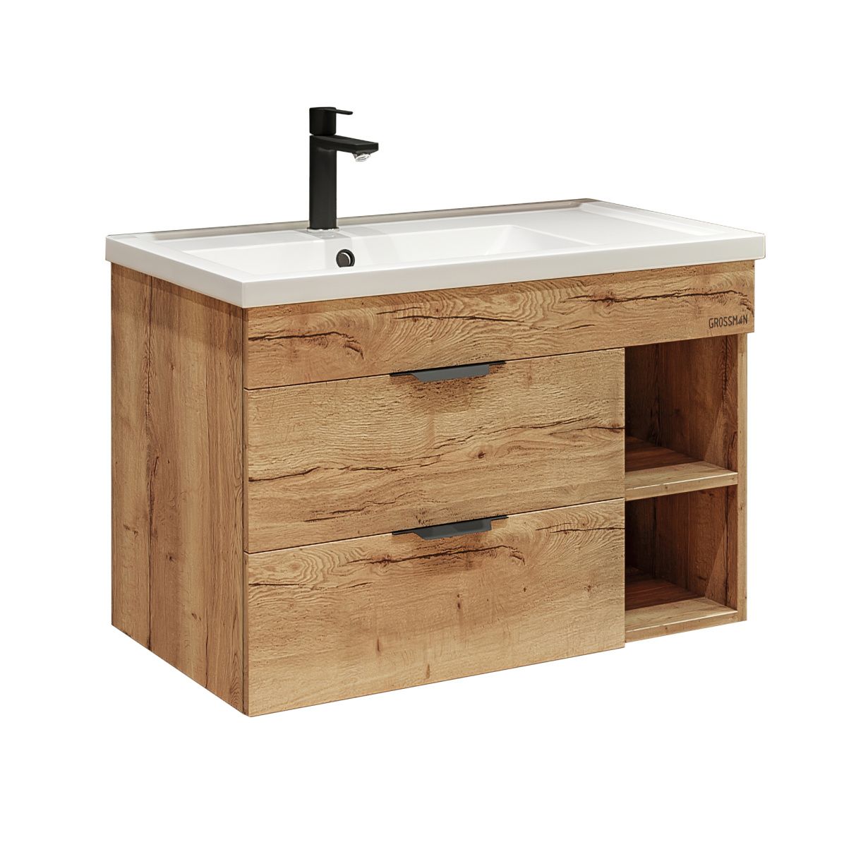 Тумба снабжена двумя ящиками, которые укомплектованы направляющими плавного закрывания, ящики предназначены для хранения различных предметов, а открытые полки справа обеспечаивают доступ к аксессуарам.