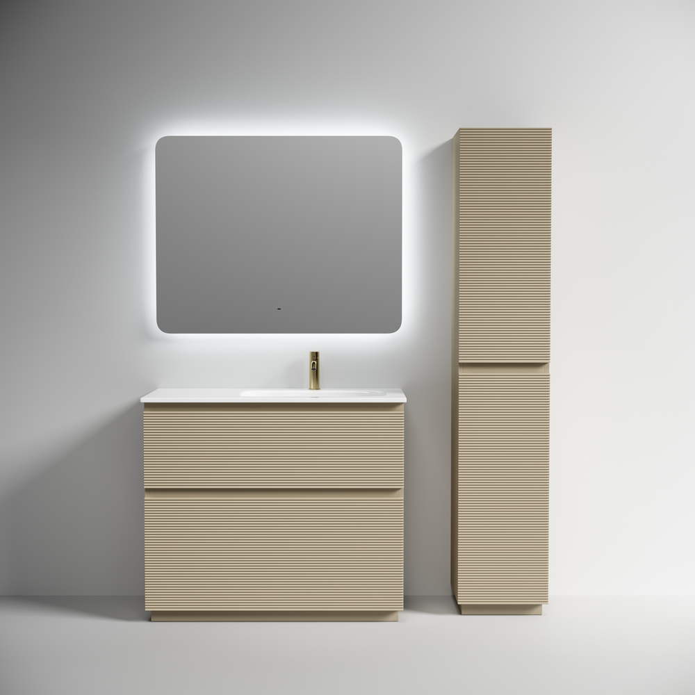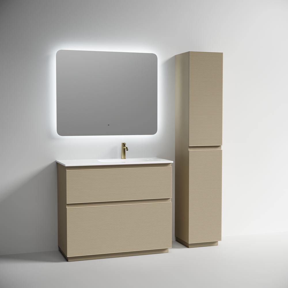 На изображении тумба Folk Floor представлена с зеркалом RAY, смесителем из коллекции ETNA и раковиной Grace CN7015