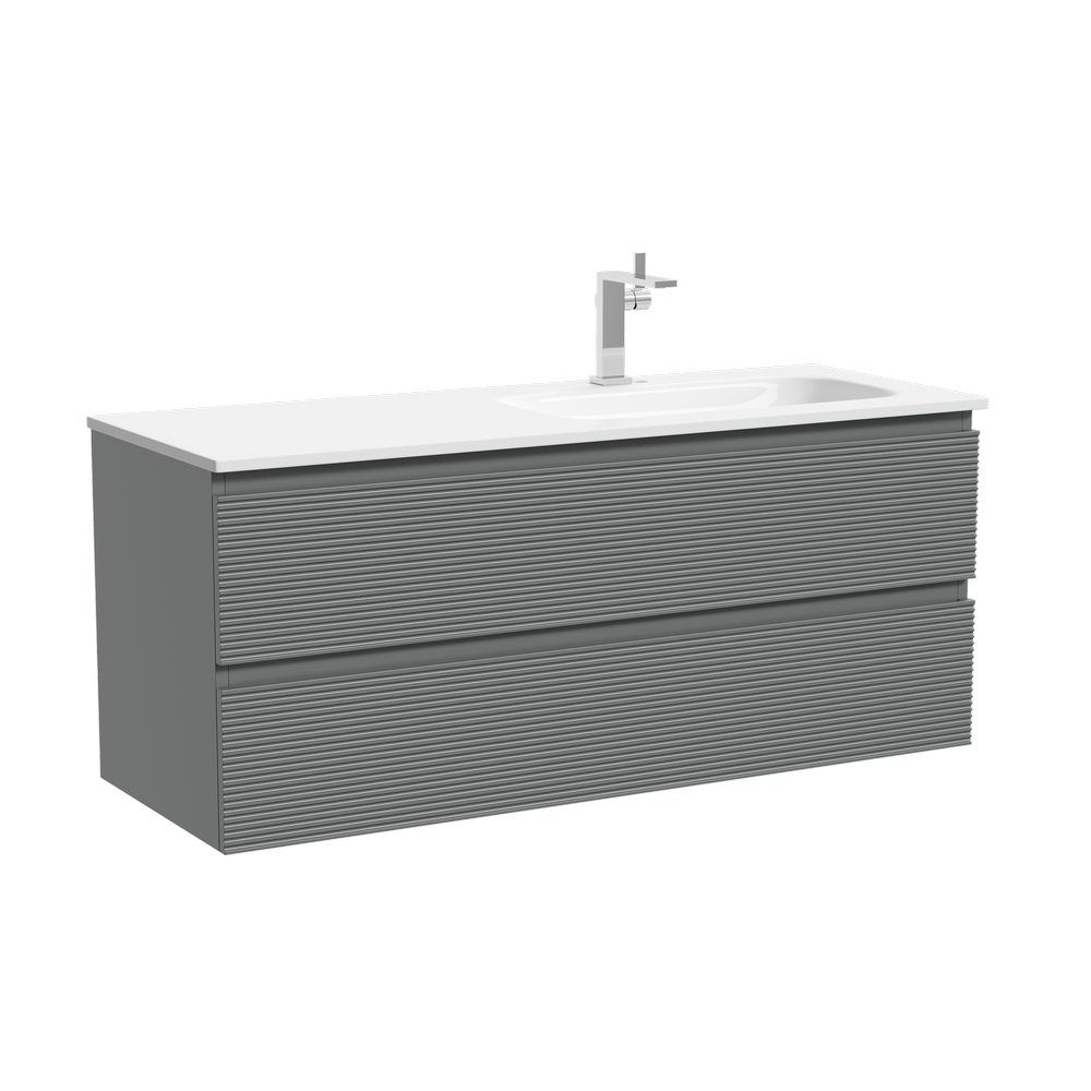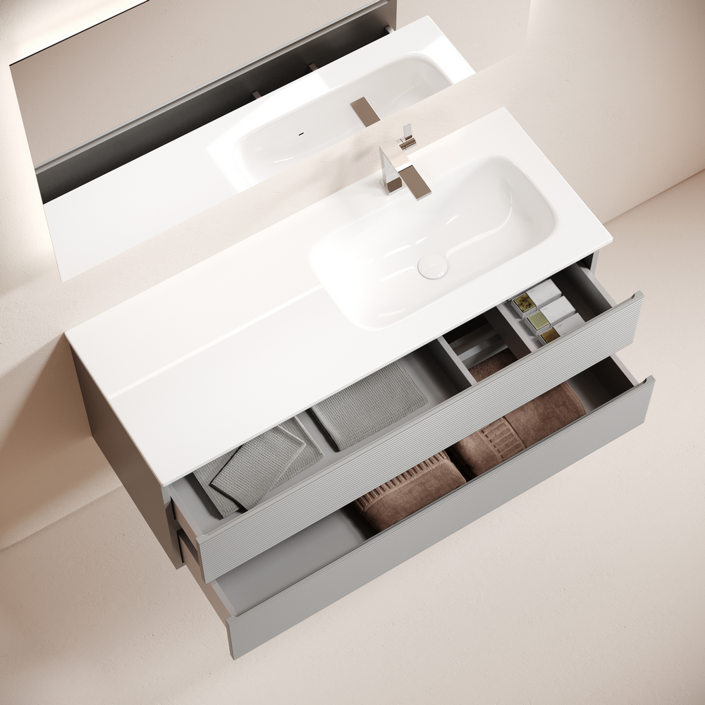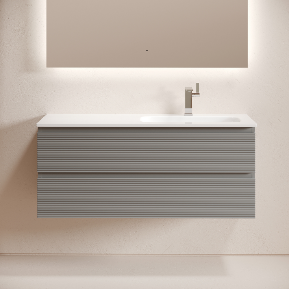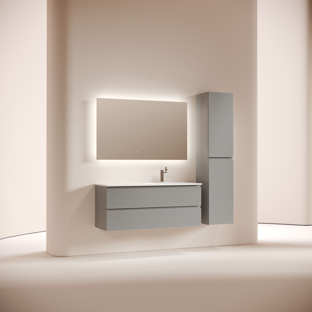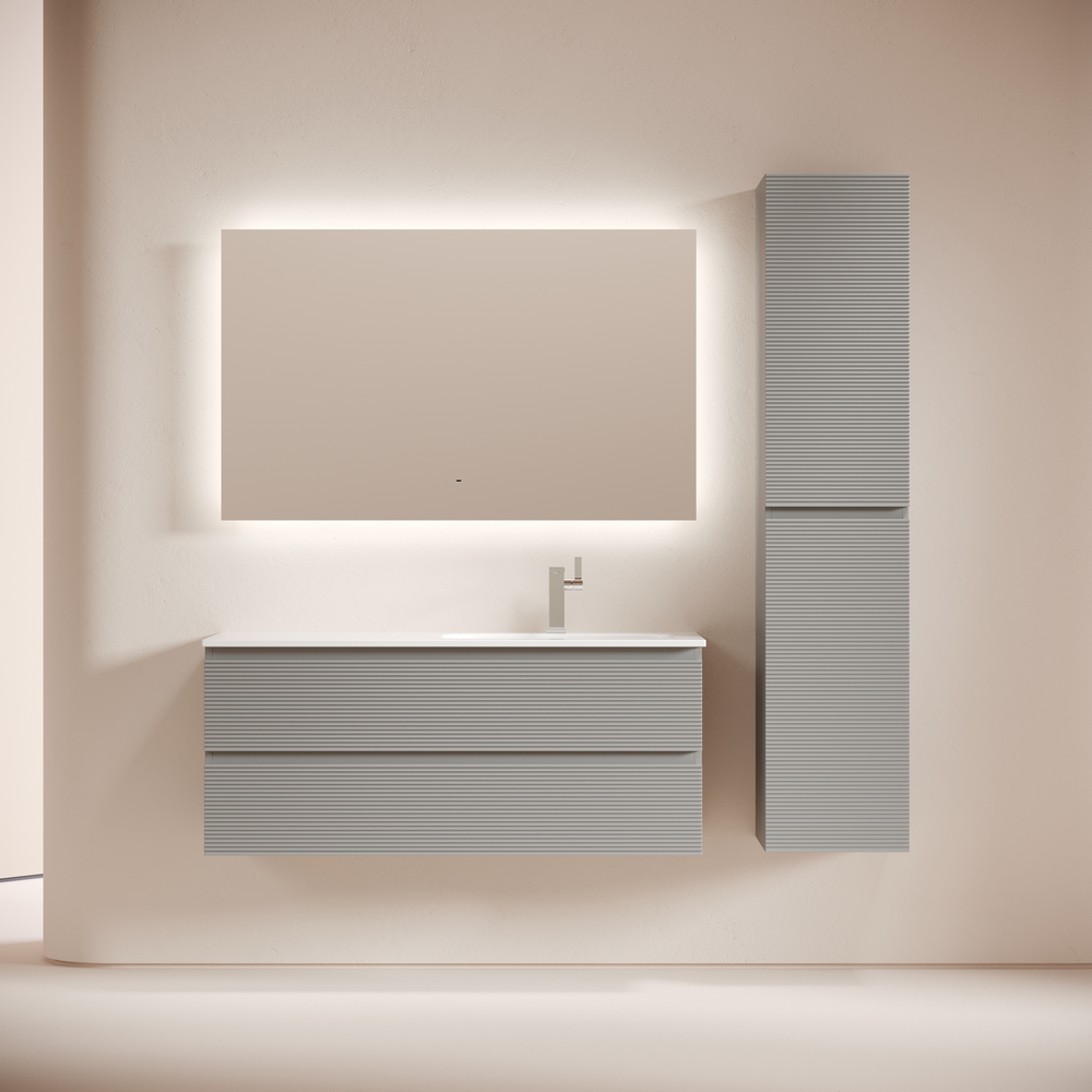 На изображении мебель Snob R представлена с зеркалом SQUARE 120 (SQ120 и смесителем из коллекции LINN (SC9019CH), раковиной Grace CN7021