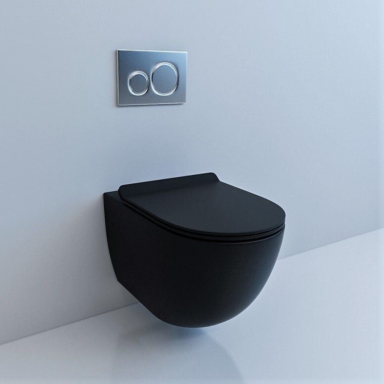 БЕЗОБОДКОВЫЙ подвесной унитаз.  Система смыва ТОРНАДО. Горизонтальный выпуск ("P-Trap" 180 мм). Цвет: чёрный матовый. Сидение: ультратонкое, быстросъёмное, дюропласт с металлическим крепежом и микролифтом (механизм "Soft Close").