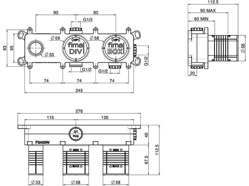 Внутренняя часть для встроенного смесителя настенного для раковины FIMA CARLO FRATTINI FimaBox F3600W, на 1 выход, может устанавливаться как вертикально, так и горизонтально, из латуни, универсальная встроенная часть для всех коллекций.