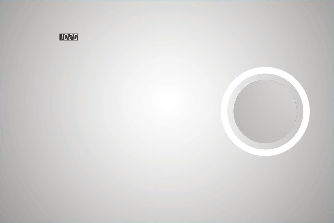 Корпус - алюминий. Инфракрасный выключатель.  Подогрев полотна. LED подсветка. Линза (ᴓ17 см). Часы. Мощность зеркала 50W.