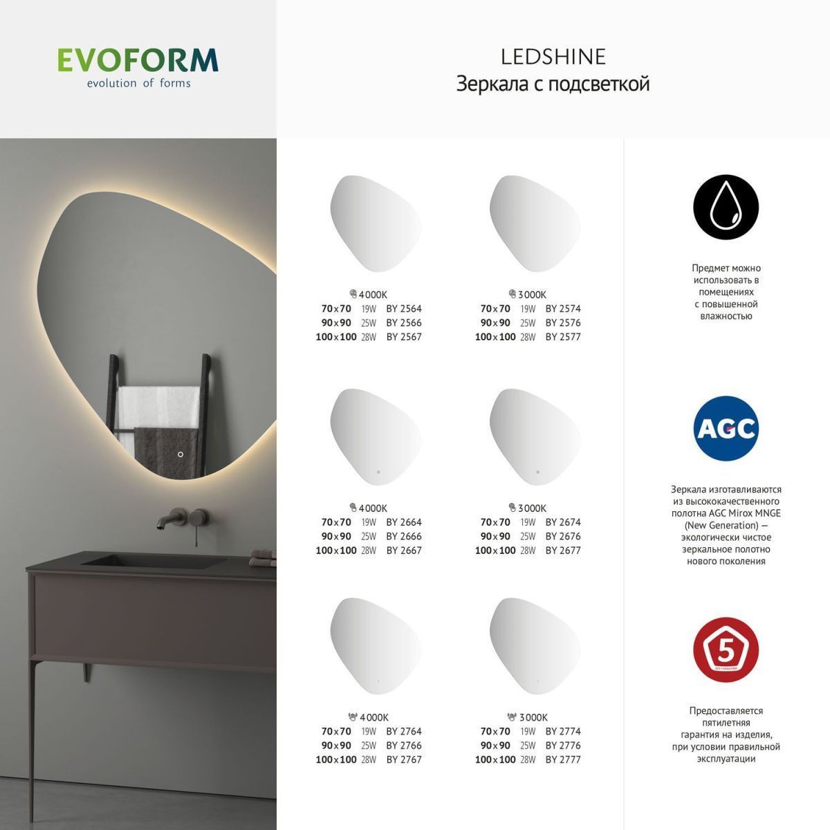 Компания ООО «САНТЕХ АЛЬЯНС» при изготовлении зеркал торговой марки «Evoform» использует серебряные зеркальные полотна мирового производителя AGC- Asahi Glass Co (Япония). AGC - первая компания, применившая новейшую технологию Mirox, которая стала мировым эталоном. Mirox New Generation Ecological - это новое поколение экологически чистых, высококачественных, стойких к воздействиям зеркал, характеристики которых превосходят требования самых строгих стандартов. ПРЕИМУЩЕСТВА: Высокие антикоррозионные свойства; Способность готового продукта противостоять химическим повреждениям; Срок полезного использования в 3 раза превышает аналогичный показатель традиционных зеркал; Повышенная стойкость к абразивным средствам очистки: в семь раз выше, чем у традиционных зеркал; Отсутствие точечной коррозии и «цветения» с течением времени; Сертификация Cradle to Cradle - безотходная система производства; Испарение летучих органических соединений и формальдегида сведено к минимуму; Устойчивы к высоким температурам при равномерном нагревании (до 80°C).  Компания располагает современным оборудованием, владеет новейшими технологиями и имеет в штате квалифицированный персонал. Высоких стандартов качества продукции предприятию удается достигнуть благодаря использованию специализированного оборудования ведущих европейских производителей и высококачественного экологически безопасного зеркального полотна. Широкий модельный ряд позволяет максимально удовлетворить самые разнообразные пожелания покупателей. ООО «САНТЕХ АЛЬЯНС» уже много лет производит и реализует зеркала для ванной комнаты, зеркала изготавливаются с соблюдением всех необходимых условий производства. По праву можно назвать наш ассортимент одним из самых больших среди европейских производителей, работающих со складским остатком.
