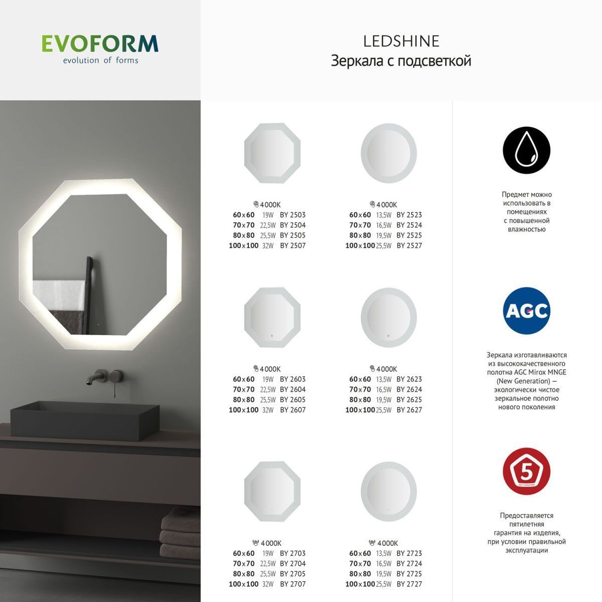 Компания ООО «САНТЕХ АЛЬЯНС» при изготовлении зеркал торговой марки «Evoform» использует серебряные зеркальные полотна мирового производителя AGC- Asahi Glass Co (Япония). AGC - первая компания, применившая новейшую технологию Mirox, которая стала мировым эталоном. Mirox New Generation Ecological - это новое поколение экологически чистых, высококачественных, стойких к воздействиям зеркал, характеристики которых превосходят требования самых строгих стандартов. ПРЕИМУЩЕСТВА: Высокие антикоррозионные свойства; Способность готового продукта противостоять химическим повреждениям; Срок полезного использования в 3 раза превышает аналогичный показатель традиционных зеркал; Повышенная стойкость к абразивным средствам очистки: в семь раз выше, чем у традиционных зеркал; Отсутствие точечной коррозии и «цветения» с течением времени; Сертификация Cradle to Cradle - безотходная система производства; Испарение летучих органических соединений и формальдегида сведено к минимуму; Устойчивы к высоким температурам при равномерном нагревании (до 80°C).  Компания располагает современным оборудованием, владеет новейшими технологиями и имеет в штате квалифицированный персонал. Высоких стандартов качества продукции предприятию удается достигнуть благодаря использованию специализированного оборудования ведущих европейских производителей и высококачественного экологически безопасного зеркального полотна. Широкий модельный ряд позволяет максимально удовлетворить самые разнообразные пожелания покупателей. ООО «САНТЕХ АЛЬЯНС» уже много лет производит и реализует зеркала для ванной комнаты, зеркала изготавливаются с соблюдением всех необходимых условий производства. По праву можно назвать наш ассортимент одним из самых больших среди европейских производителей, работающих со складским остатком.