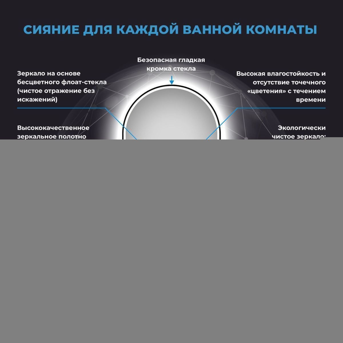 Безупречное японское стекло — результат непрерывного развития технологий, оно соответствует единой системе защиты от коррозии и отсутствию точечного «цветения» с течением времени. В зеркале с интерьерной и фронтальной подсветкой функциональность гармонично соединена с дизайном. Интерьерная подсветка, наполняет пространство светом и придает конструкции легкость. Фронтальный свет создает рассеянный комфортный для глаз поток, позволяющий рассмотреть каждую деталь отражения во время гигиенических и косметологических процедур.