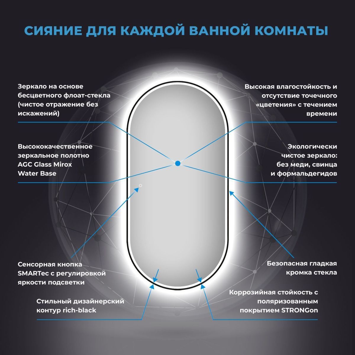 Безупречное японское стекло — результат непрерывного развития технологий, оно соответствует единой системе защиты от коррозии и отсутствию точечного «цветения» с течением времени. В зеркале с интерьерной и фронтальной подсветкой функциональность гармонично соединена с дизайном. Интерьерная подсветка, наполняет пространство светом и придает конструкции легкость. Фронтальный свет создает рассеянный комфортный для глаз поток, позволяющий рассмотреть каждую деталь отражения во время гигиенических и косметологических процедур.