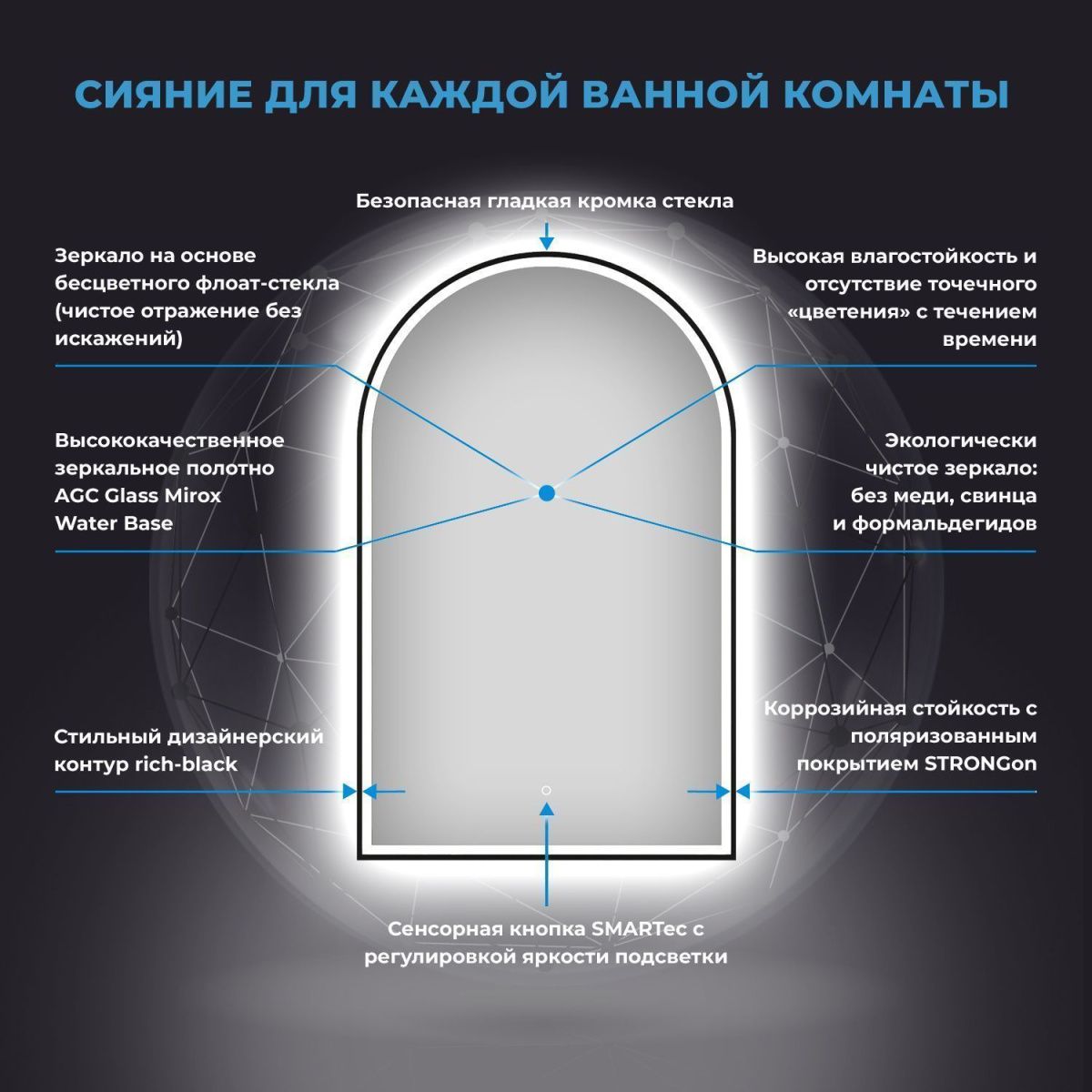 Безупречное японское стекло — результат непрерывного развития технологий, оно соответствует единой системе защиты от коррозии и отсутствию точечного «цветения» с течением времени. В зеркале с интерьерной и фронтальной подсветкой функциональность гармонично соединена с дизайном. Интерьерная подсветка, наполняет пространство светом и придает конструкции легкость. Фронтальный свет создает рассеянный комфортный для глаз поток, позволяющий рассмотреть каждую деталь отражения во время гигиенических и косметологических процедур.