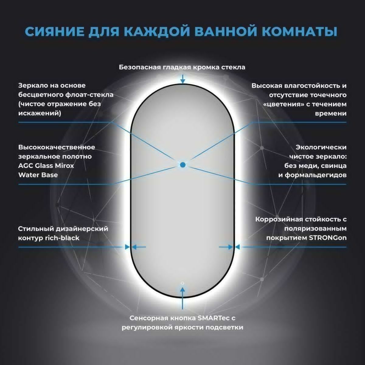 Безупречное японское стекло — результат непрерывного развития технологий, оно соответствует единой системе защиты от коррозии и отсутствию точечного «цветения» с течением времени. Зеркало с интерьерной подсветкой – простое и удобное решение, которое создает расслабляющую атмосферу в ванной комнате. Плотный поток света от LED-ленты, установленной с обратной стороны полотна, создает равномерный ореол идеальной формы и подчеркивает достоинства умывальной зоны.