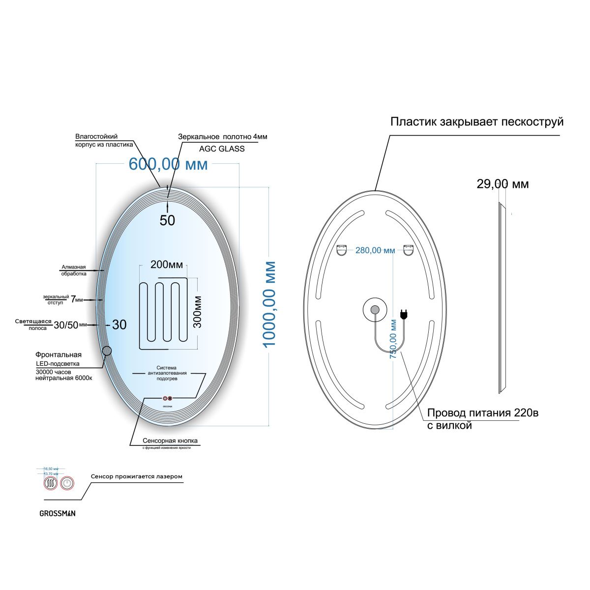 Так же в зеркале присутствует антизапотевание (подогрев). Управление подсветкой и подогревом осуществляется сенсорным выключателем. В комплект поставки входит крепеж. Изделие прошло обязательную сертификацию и может использоваться в помещениях с повышенной влажностью воздуха.
