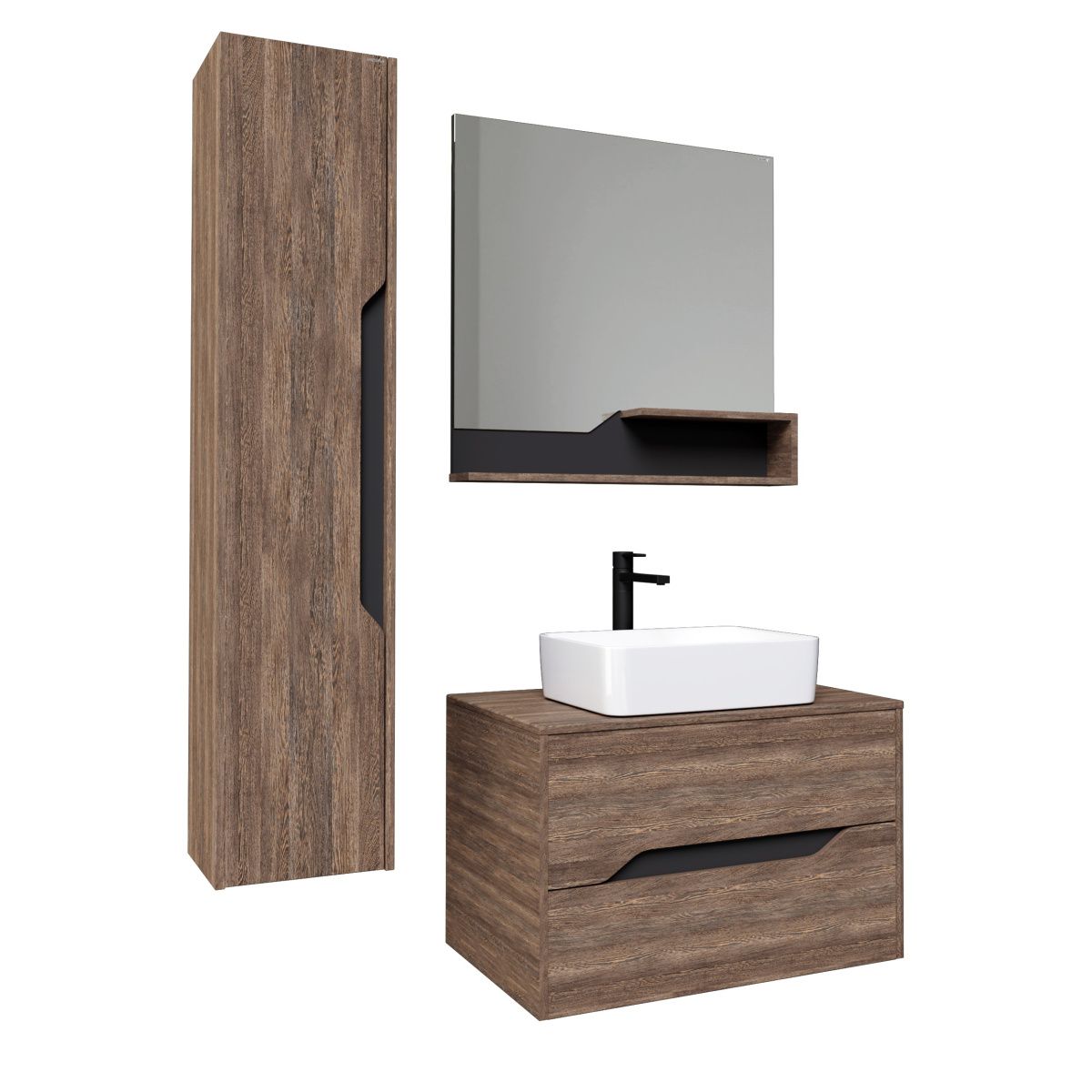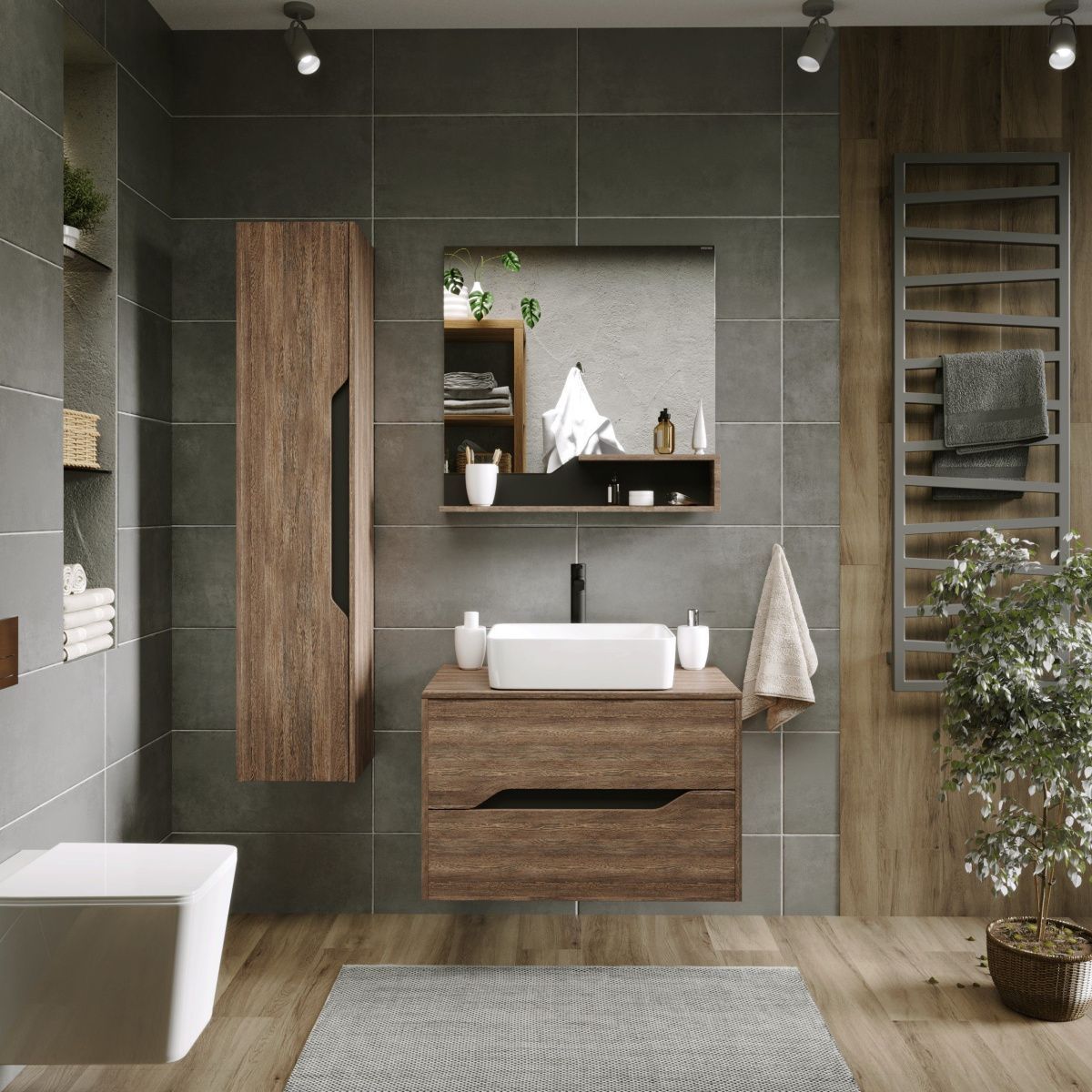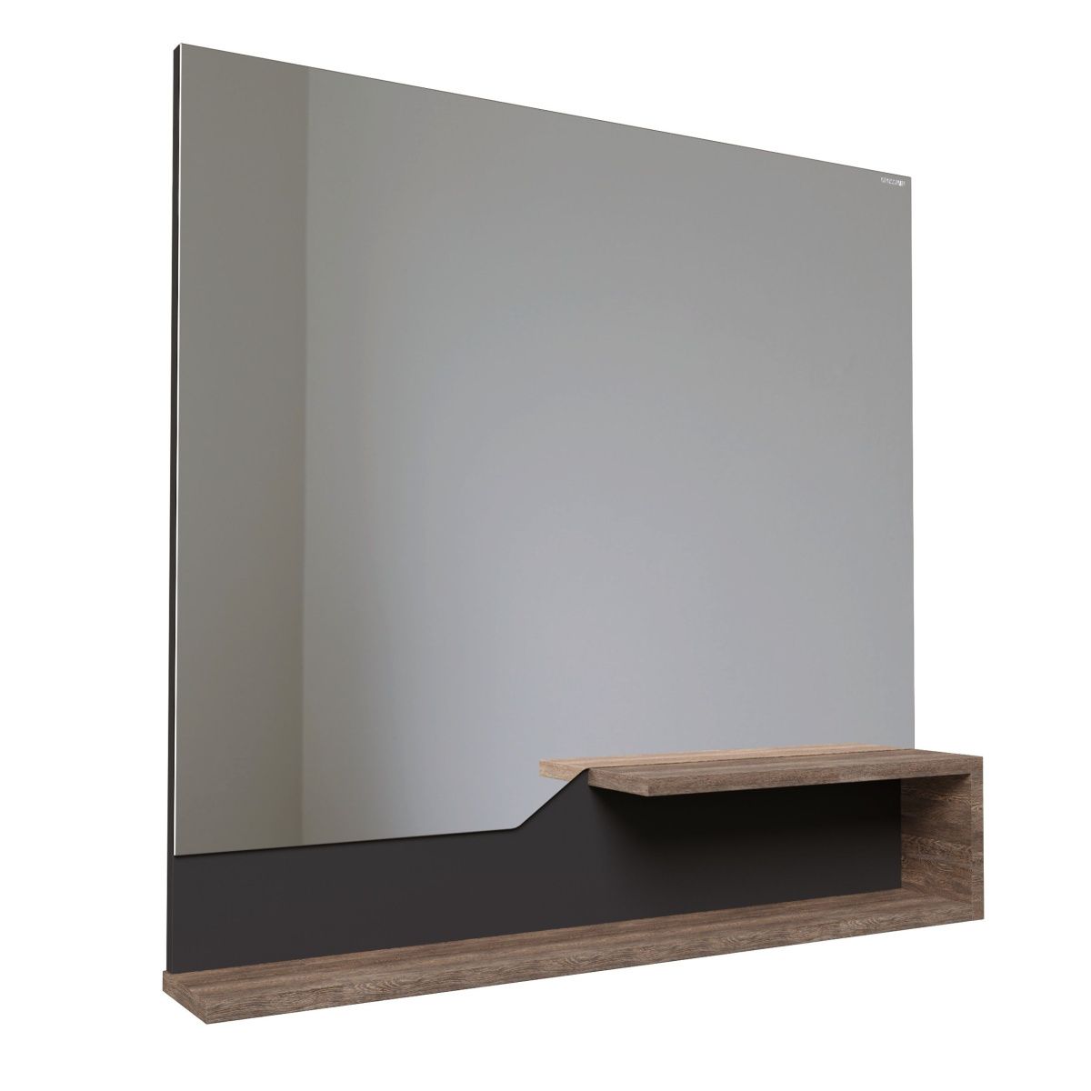 Зеркало изготовлено из влагостойких материалов, устойчивое к механическим воздействиям, перепадам температуры и высокой влажности. Корпус ЛДСП графит, полка МДФ в пленке винтажное дерево темное.
