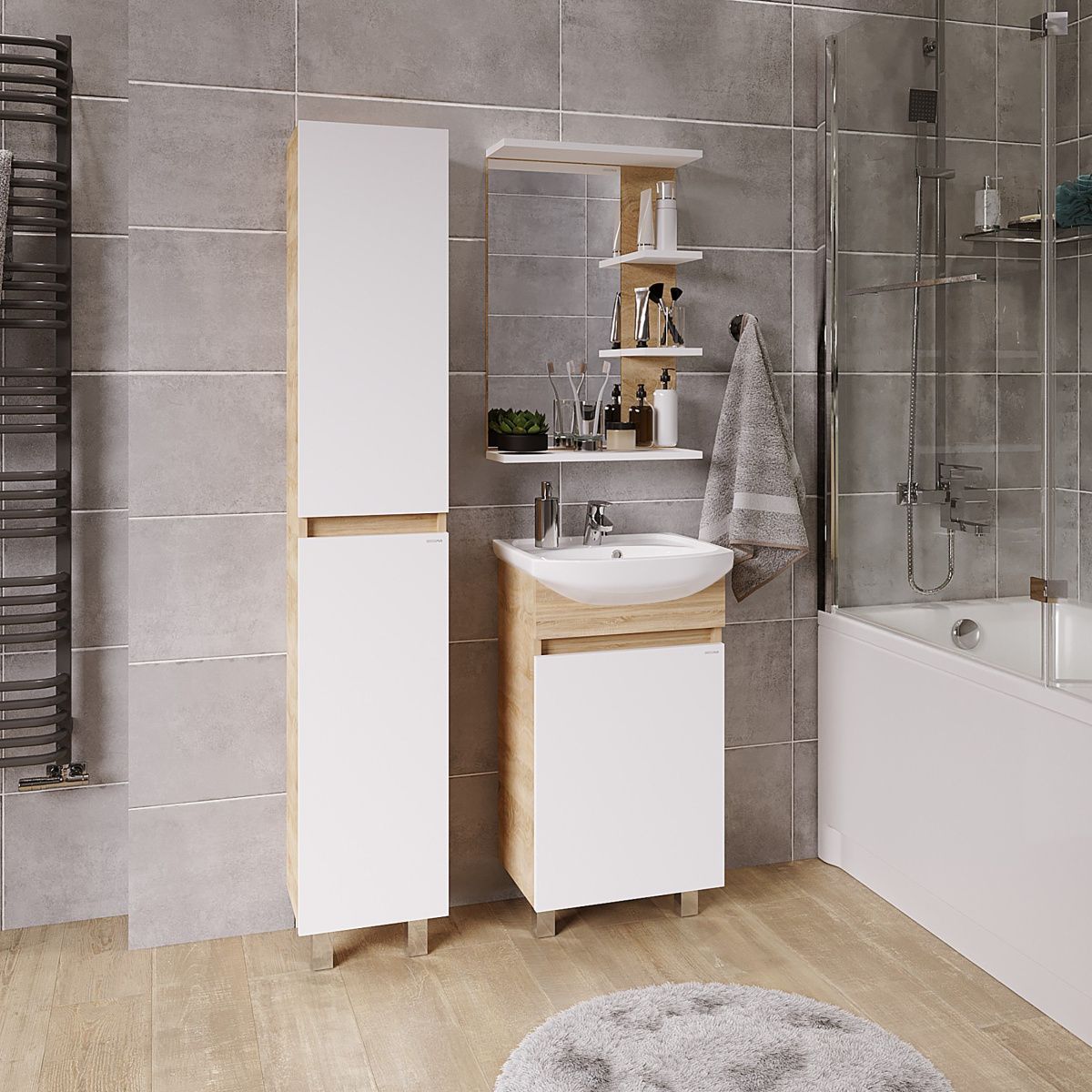 Компактные габариты позволяют грамотно организовать небольшой санузел, а сочетание структуры натурального дерева с белой глянцевой отделкой гармонично впишется в интерьер любой ванной комнаты.
